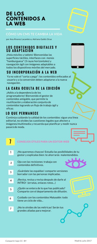 La gestión y edición de contenidos digitales sigue requiriendo de conocimientos y tareas que no varían en el tiempo: cuidar la calidad implica conocer las limitaciones en la difusión por cuestiones legales (desde la privacidad hasta la propiedad intelectual), escribir con una coherencia y tono adecuado a nuestros usuarios, sin olvidarnos de planificar y medir lo que hacemos.