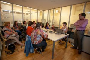 Durante la tarde, Felipe desplegó todo su material y su capacidad expansiva de comunicación, puso del revés todo lo formal del encuentro y convirtió la preciosa capilla de la antigua Escuela Normal en una escuela de guiñol, en la que los bibliomovileros acabamos aprendiendo técnicas de expresión teatral, fabricamos el esqueleto básico de un títere y descubrimos que trucos existen para dotarlo de vida. Toda una experiencia física y mental, agotadora pero imprescindible. “Pipe”, Felipe, tiene la energía que necesitamos en los bibliomóviles, la ilusión infantil por contar y oír historias, está atento a la realidad y actúa sobre ella, mejorándola. ¿Existe otra manera de conducirnos en la tarea de las bibliotecas en general y los bibliobuses en particular?