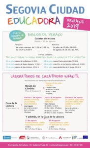 Las casetas tienen un amplio horario, distribuido en mañana y tarde, prestando servicio durante cuatro horas diarias. Las mañanas se dedican a los talleres de animación lectora para los más pequeños, contando para ello con personal cualificado y formado a lo largo del año en el Taller Municipal de Anima a la Lectura, fundamentalmente estudiantes de últimos años de Magisterio y Monitores de ocio y tiempo libre, que bajo la dirección de Elena Marqués diseñarán y llevarán a cabo divertidas actividades: yincanas literarias, talleres de reciclaje, escritura creativa, modelado, fotografía… cada día un taller diferente y siempre con un enfoque lúdico pero anclados en los libros. Autores como Gloria Fuertes, Rodari, Machado o personajes de cuentos clásicos, cobrarán vida bajo el sol del verano para disfrute de los más pequeños. Además, dentro del programa ‘Segovia Ciudad Educadora’, la Concejalía de Desarrollo Económico, Empleo e Innovación, que alberga el Centro de Información Europe Direct, proponen talleres sobre la Unión Europea para la infancia y la juventud realizados por la oficina de información Europe Direct en las casetas de las biblios de verano.