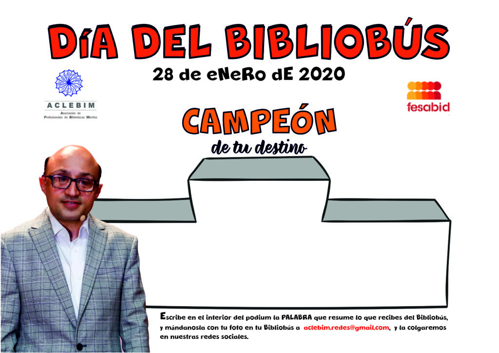 El lema de la campaña de ACLEBIM, para este 2020, es “Con el Bibliobús eres campeón de tu destino”, a partir de la imagen del actor Jesús Vidal, premio Goya “Actor Revelación” en la película “Campeones”, y ejemplo patente de superación para todos. En este sentido, estamos pidiendo en estos días a cuantas personas visitan el Bibliobús sus observaciones sobre lo que vienen recibiendo de los Bibliobuses y su personal.