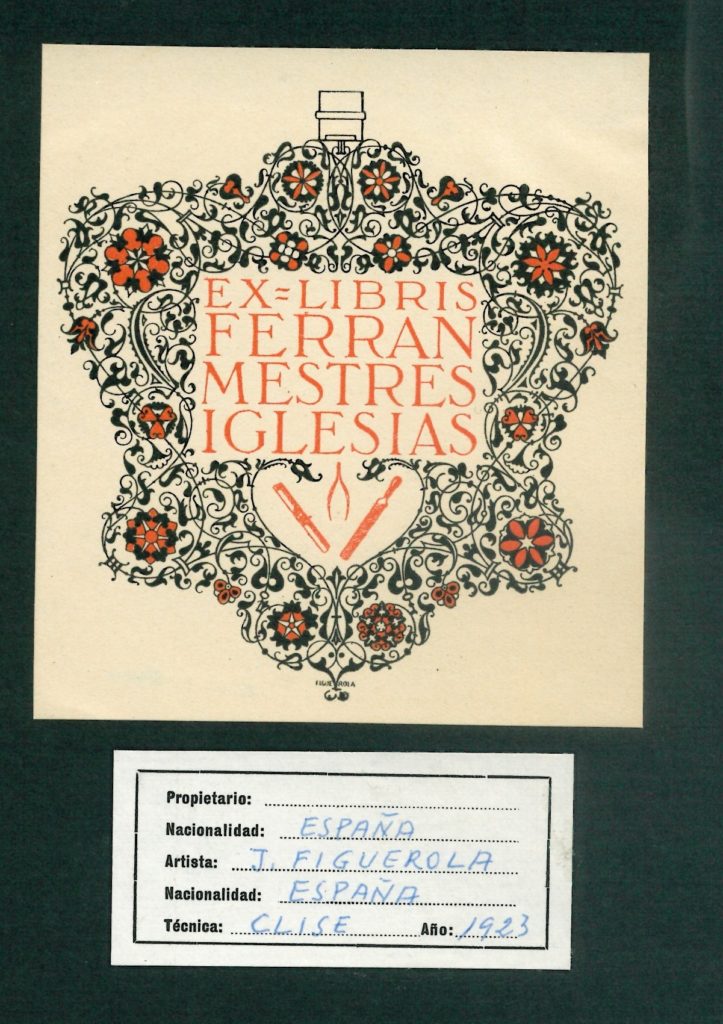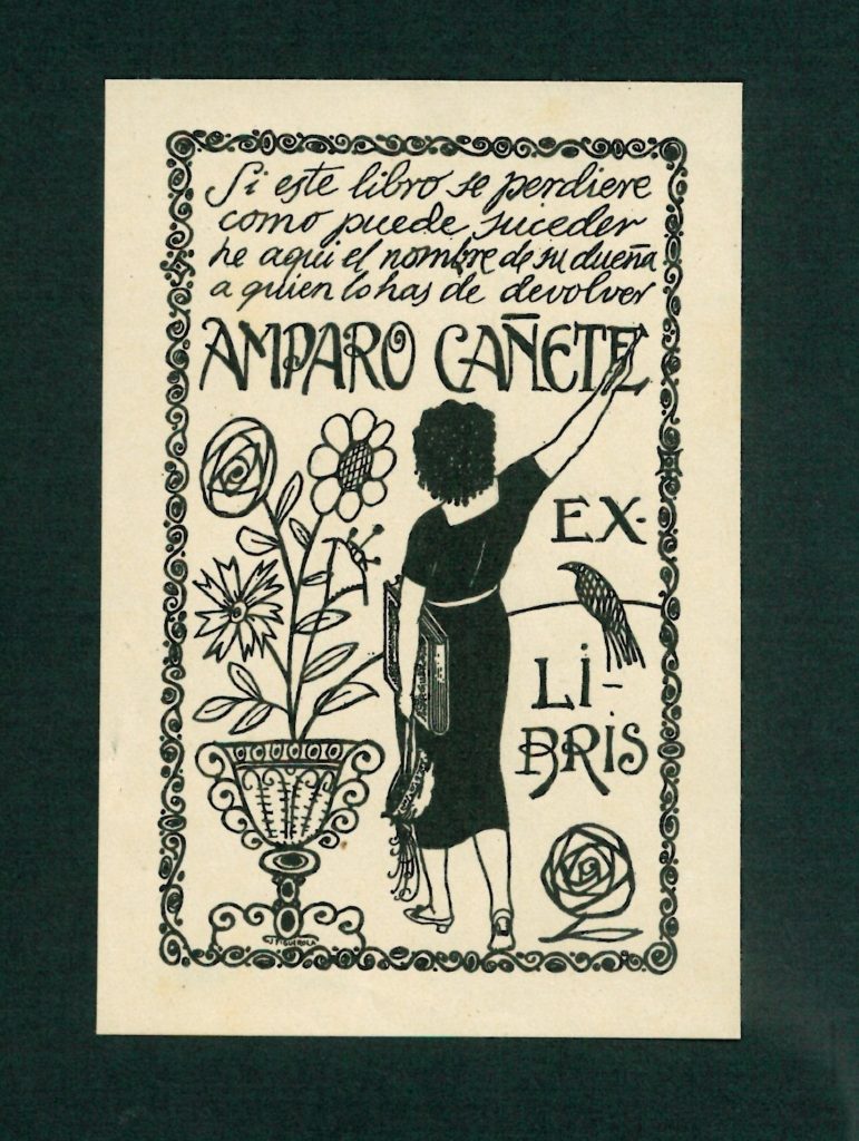 Otra sección interesante es la dedicada a los ex libris de Joaquín Figuerola Fernández y a su hija María Figuerola Rubio. Joaquín (Barcelona 1878 – 1946), grabador y ex librista, colaboró en el Instituto Catalán de las Artes del Libro, desde donde publicaría un tratado sobre xilografía. Fue decano de la Escuela Elemental del Trabajo en Barcelona. En la exposición destaca el dedicado a Amparo Cañete en el que puede leerse:
